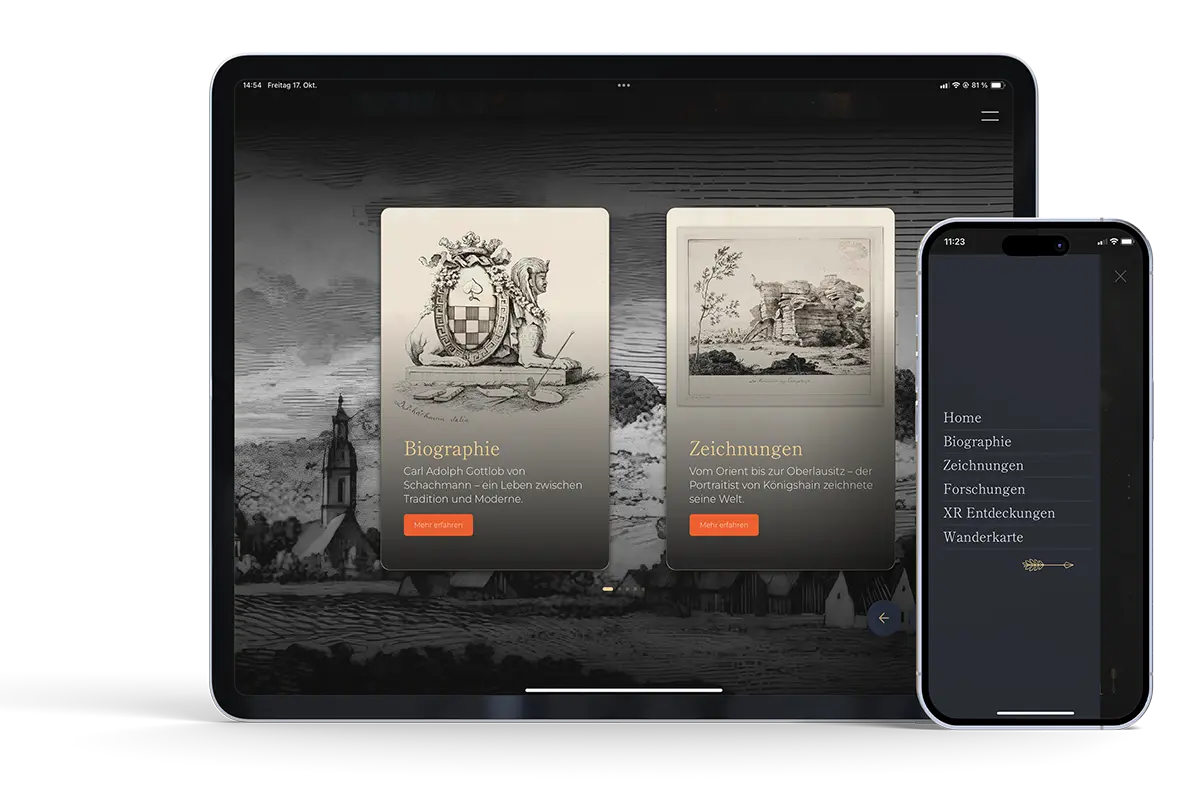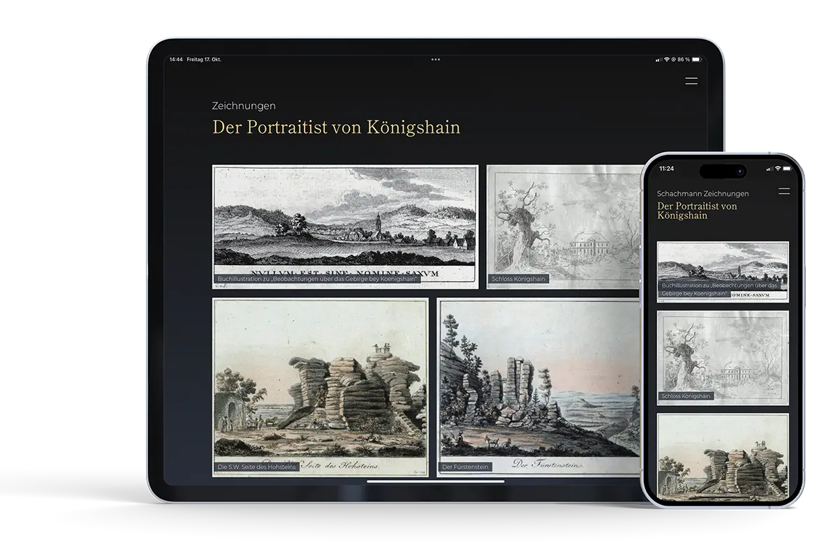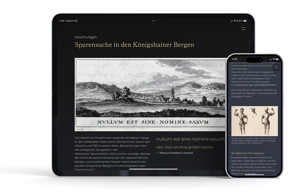 Die Tourismus App verbindet interaktive Biografie, AR-Bildergalerien und detailgetreue 3D-Modelle historischer Stätten zu einem immersiven Geschichtserlebnis. Besucher erkunden Schachmanns Zeichnungen als Augmented-Reality-Projektionen im eigenen Raum, entdecken den geheimnisvollen Kuckuckstein und Totenstein als interaktive XR-Exponate und folgen auf einer GPS-gesteuerten Wanderkarte Schachmanns Spuren durch Königshain und Umgebung.